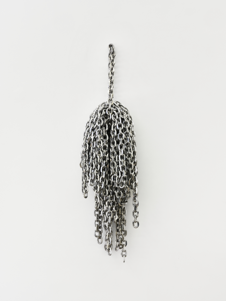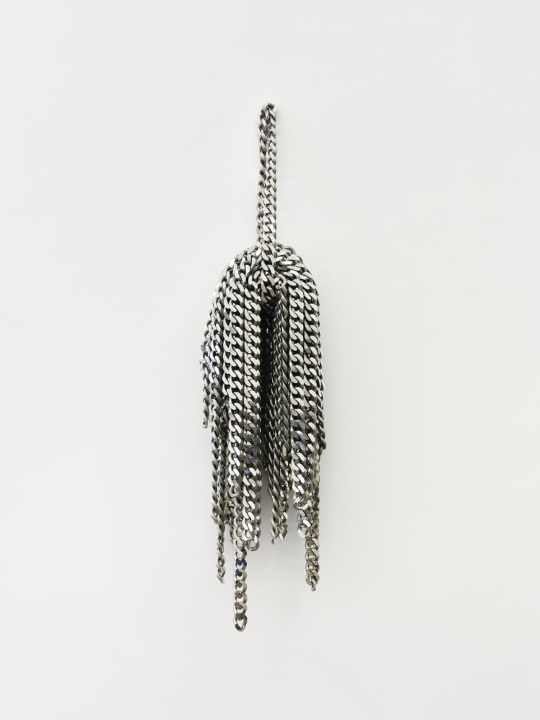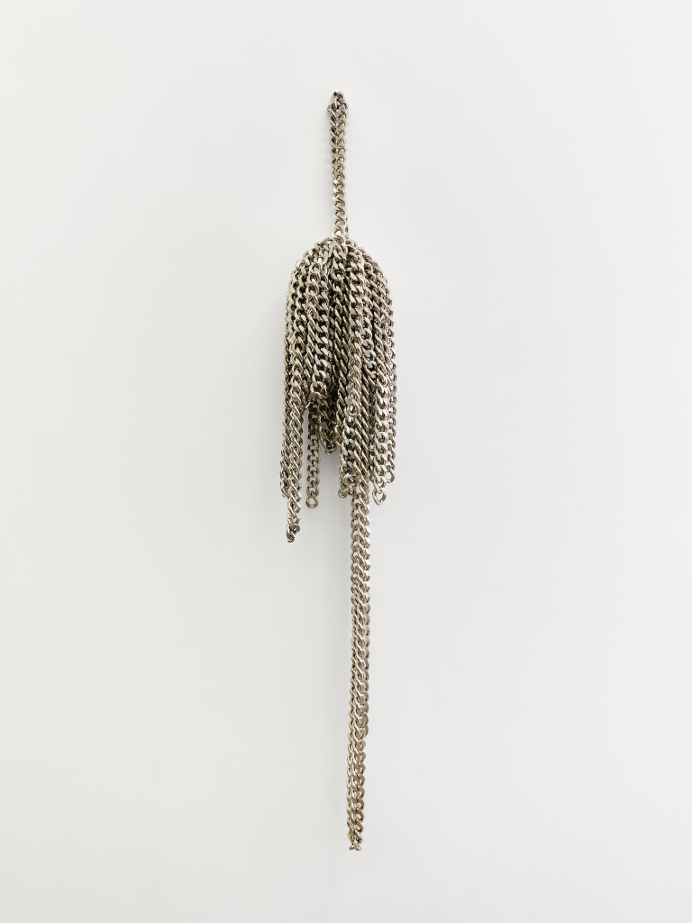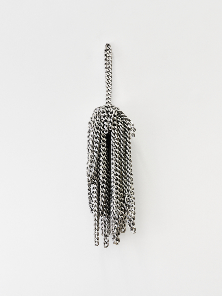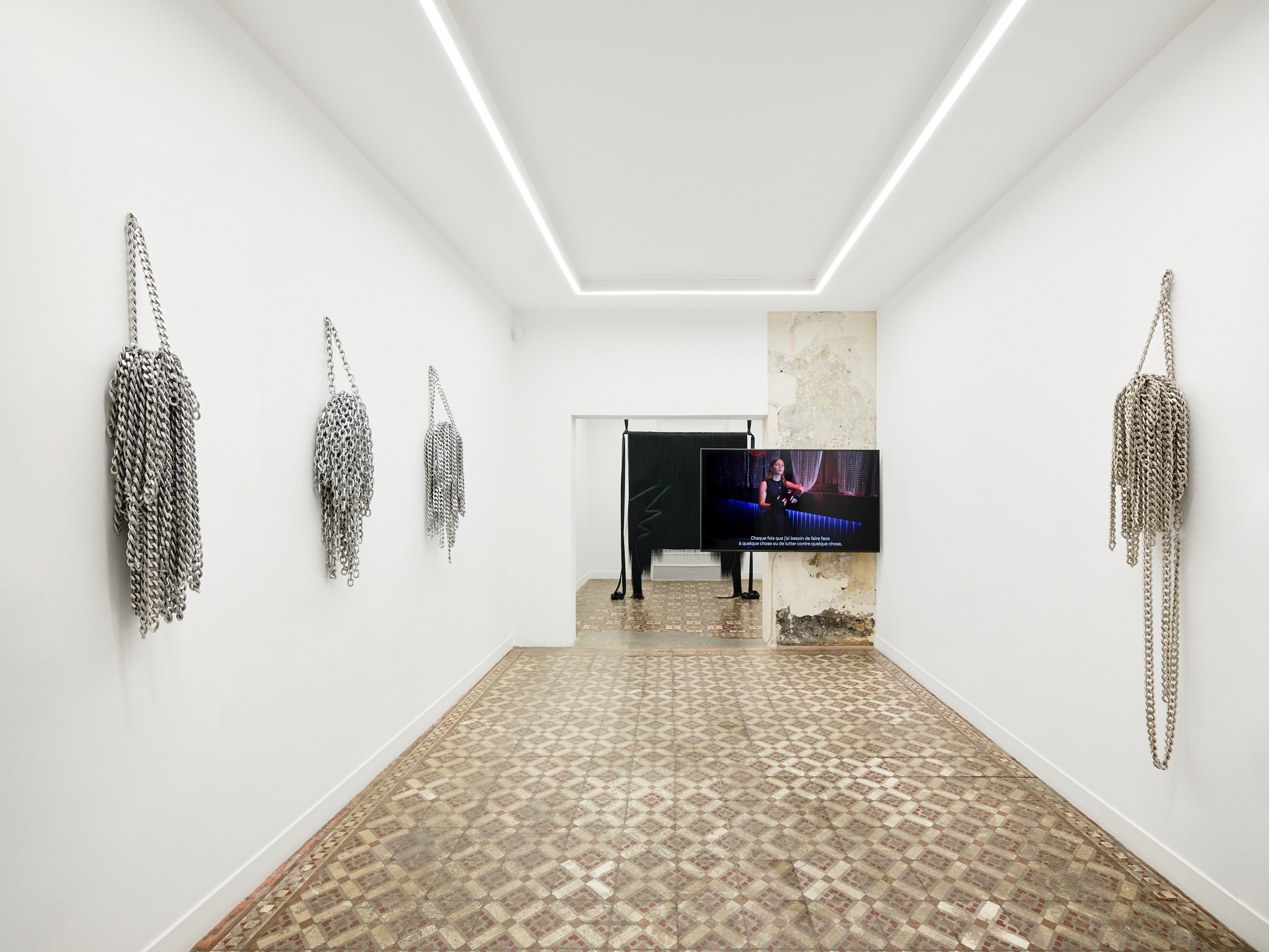 Over the years, the Wig Pieces and Chain Pieces developed by Pauline and Renate have become signature accessories for these elusive protagonists. Borrowed from the worlds of celebration, drag, and constraint, these objects form an improbable family that evokes contradictory impressions in each viewer. The polished, shiny texture of the chains, the density and softness of the hair, their eroticism — all contrast with the unease triggered by the mental image of an absent body being bound by these chains or stripped of that hair. Like the film protagonists themselves, they are intended to create unexpected encounters, rooted in what might be called a 'queer surrealism' steeped in minoritarian cultures.