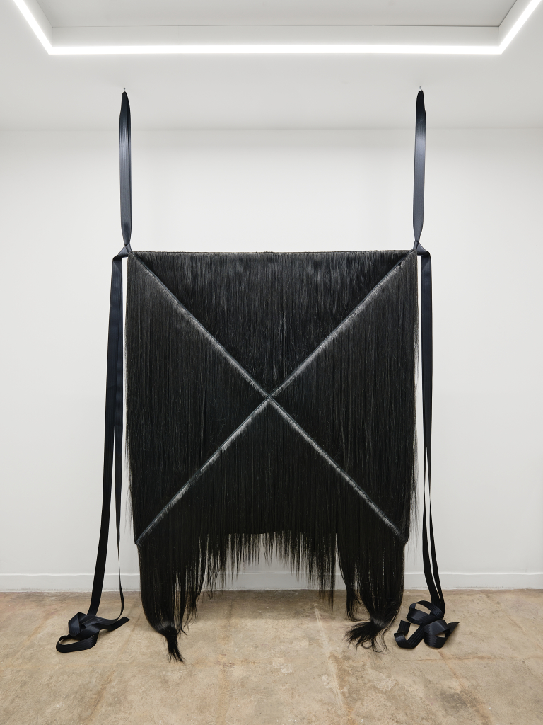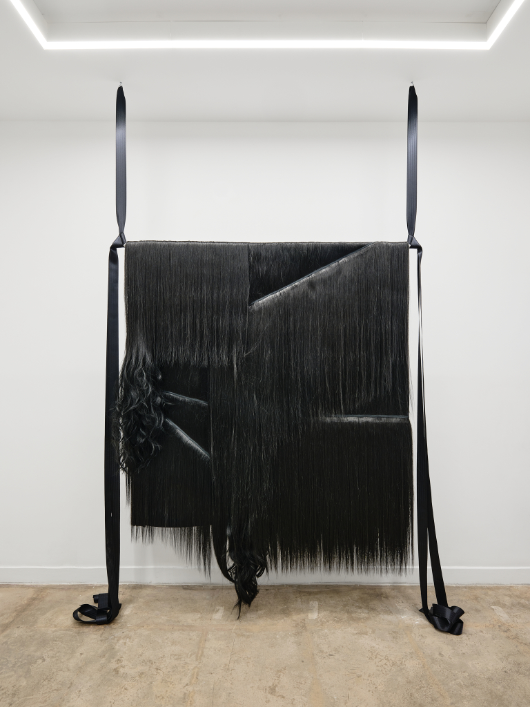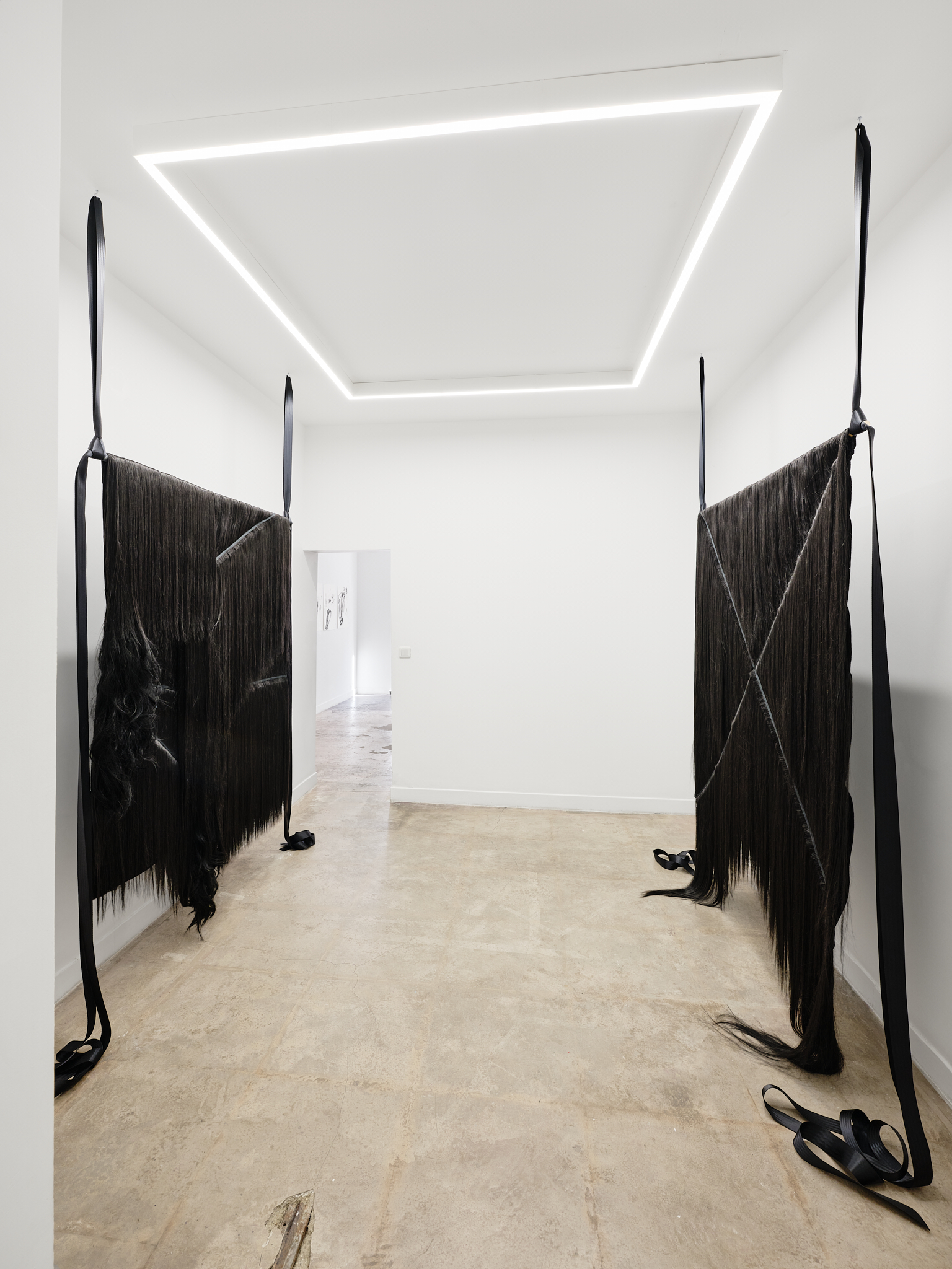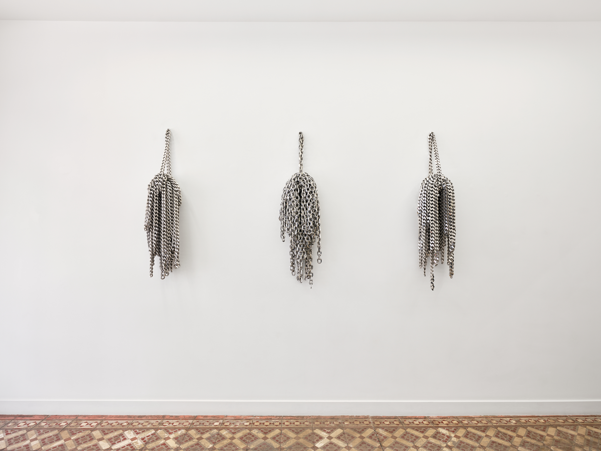 Over the years, the Wig Pieces and Chain Pieces developed by Pauline and Renate have become signature accessories for these elusive protagonists. Borrowed from the worlds of celebration, drag, and constraint, these objects form an improbable family that evokes contradictory impressions in each viewer. The polished, shiny texture of the chains, the density and softness of the hair, their eroticism — all contrast with the unease triggered by the mental image of an absent body being bound by these chains or stripped of that hair. Like the film protagonists themselves, they are intended to create unexpected encounters, rooted in what might be called a 'queer surrealism' steeped in minoritarian cultures.