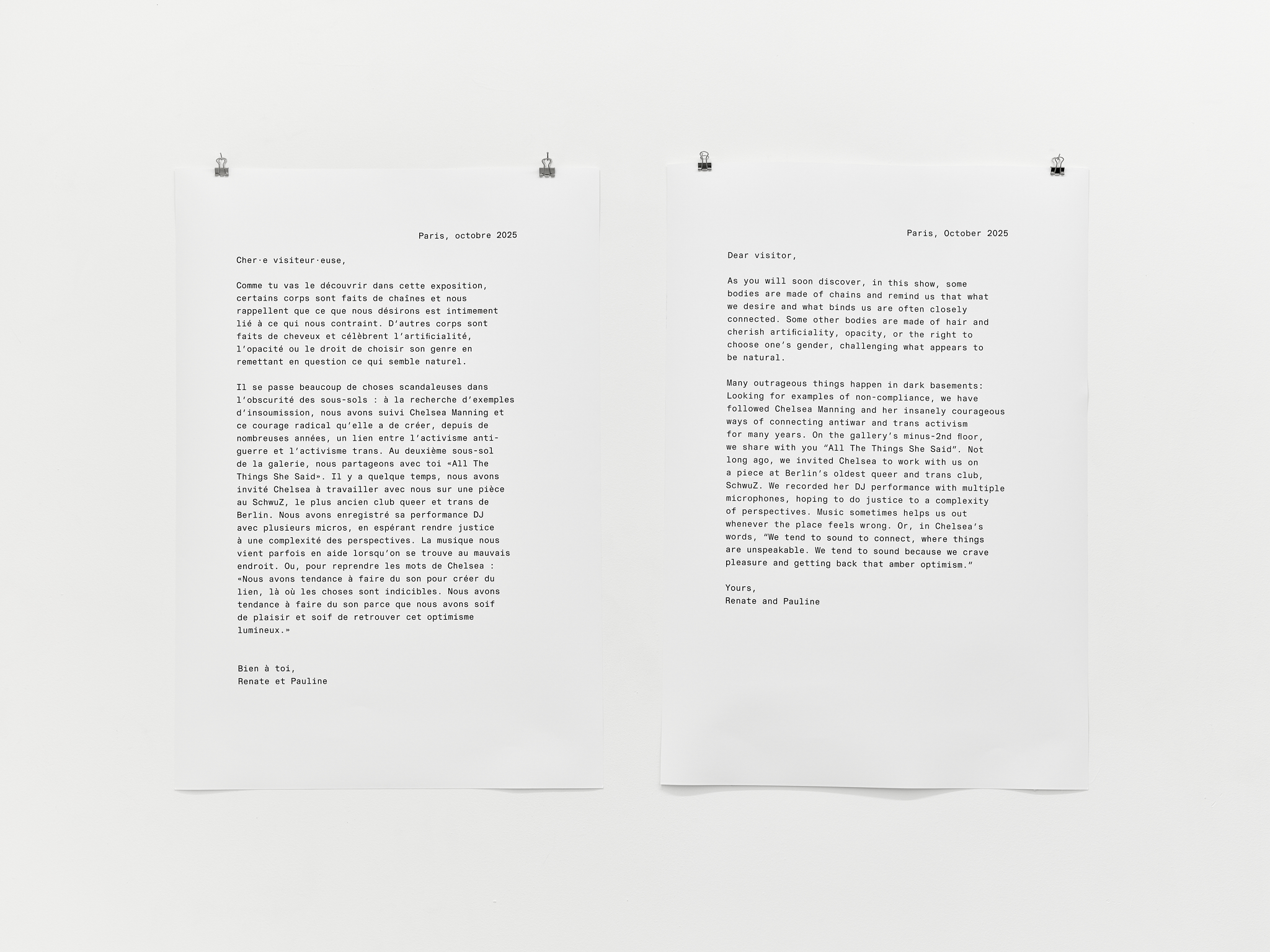Au fil des années, les Wig Pieces et les Chain Pieces qu’ont développées Pauline et Renate sont devenues les accessoires principaux de ces protagonistes à l’identité introuvable. Empruntés à la fois au monde de la fête, du travestissement et de la contrainte, ces objets forment une famille improbable qui produit pour chacun·e des impressions contradictoires. L’aspect poli et brillant des chaînes, la densité et la douceur des cheveux, leur érotisme contraste avec la sensation de malaise accompagnant l’image mentale d’un corps absent contraint par ces chaînes ou auquel on aurait retiré ces cheveux. Il s’agit, comme pour les protagonistes des films, de créer des rencontres inédites relevant de ce qu’on pourrait désigner comme un 'surréalisme queer', baigné de cultures minoritaires.